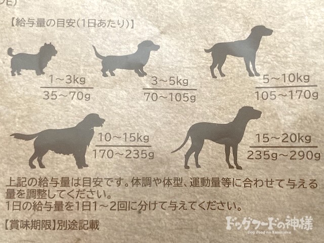 給餌量は目安にすぎません。愛犬の体質や健康状態、体型に応じて調整してください。