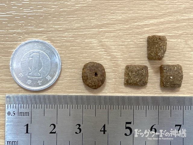 粒サイズを比較するべく、1円玉と私がいつも愛犬に用意している「モグワン」、そしてオージーラムプラスを並べました。